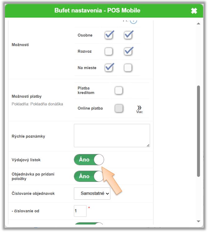 • Ak má byť tlačený objednávkový lístok, aktivujte Tlačiť donáškový lístok.