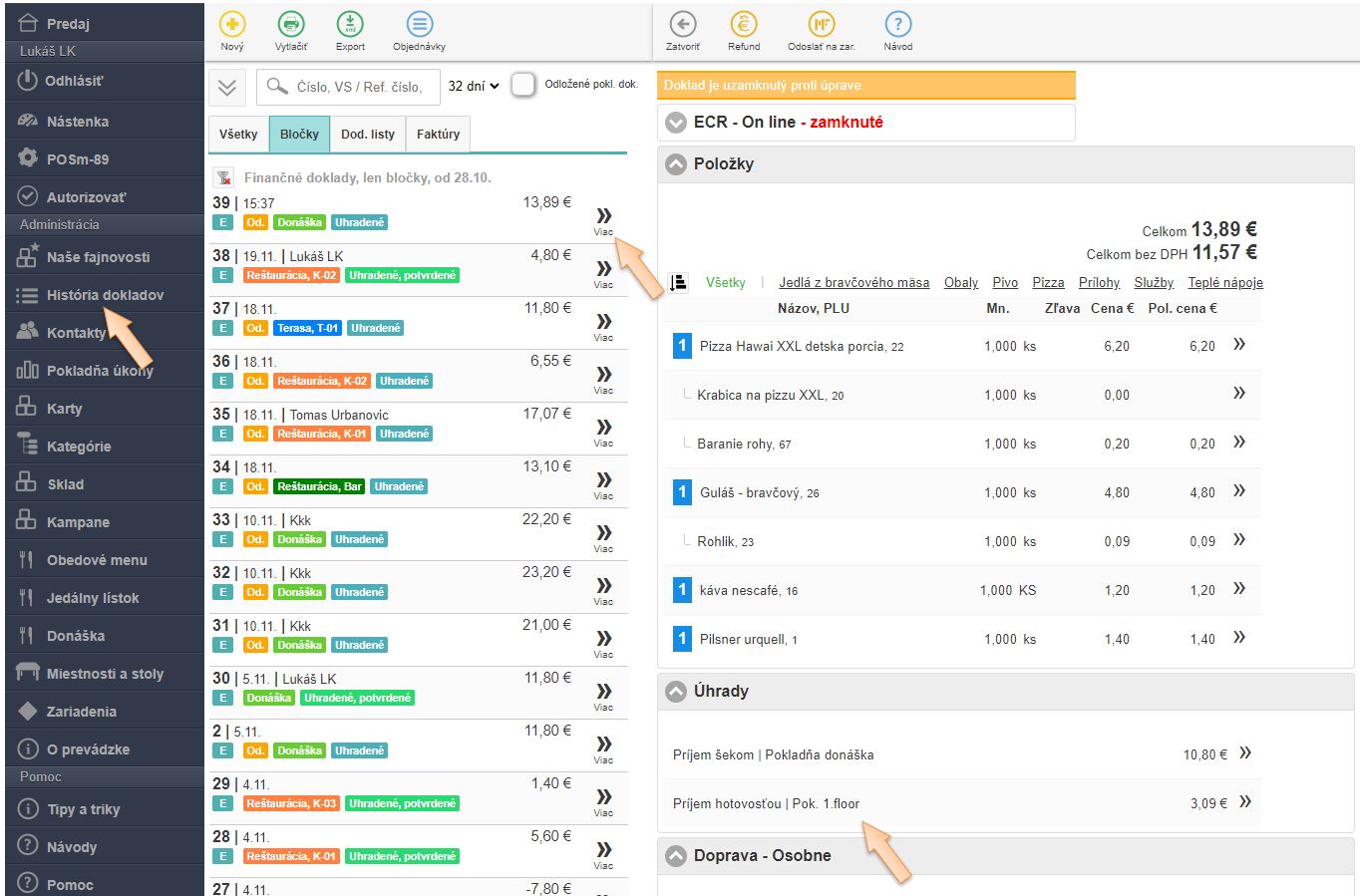 - Kliknite na ikonu platidla pre doplatenie zvyšnej sumy, napr. Príjem hotovosť.
