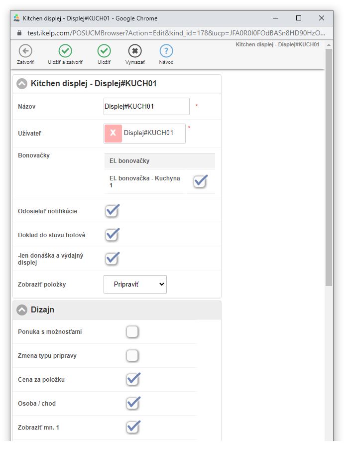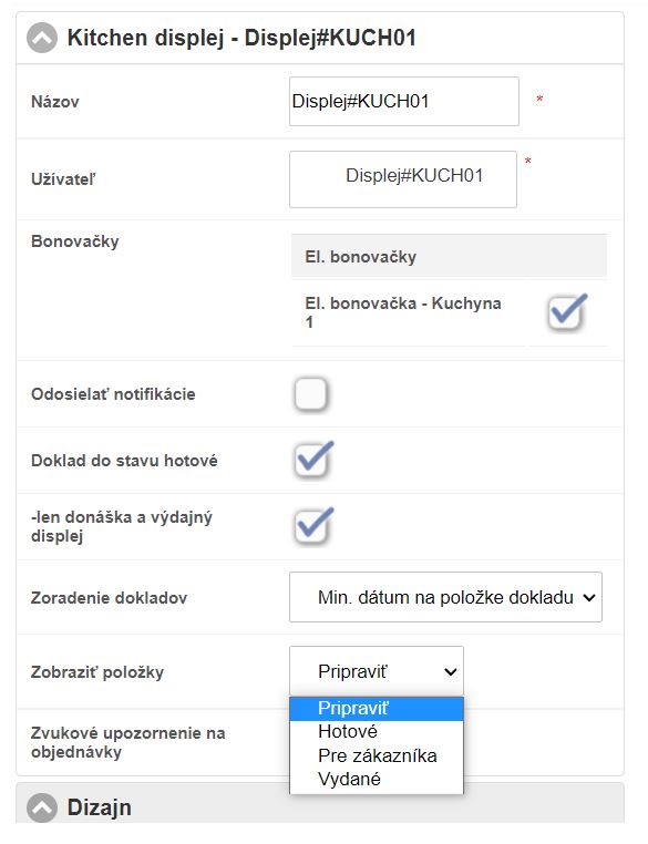 2. V záložke Zariadenia, časť Kitchen displeje vyberte zariadenie ktoré chcete nastaviť.