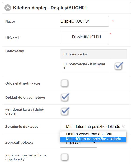 • Min. dátum na položke dokladu - položky sa na displeji zobrazujú v poradí podľa toho, ako sú pridávané do dokladov / objednávok. (Tento scenár je vhodný pri reštauračných prevádzkach, kde si hostia postupne doobjednávajú a objednávky sú vybavované priebežne.)