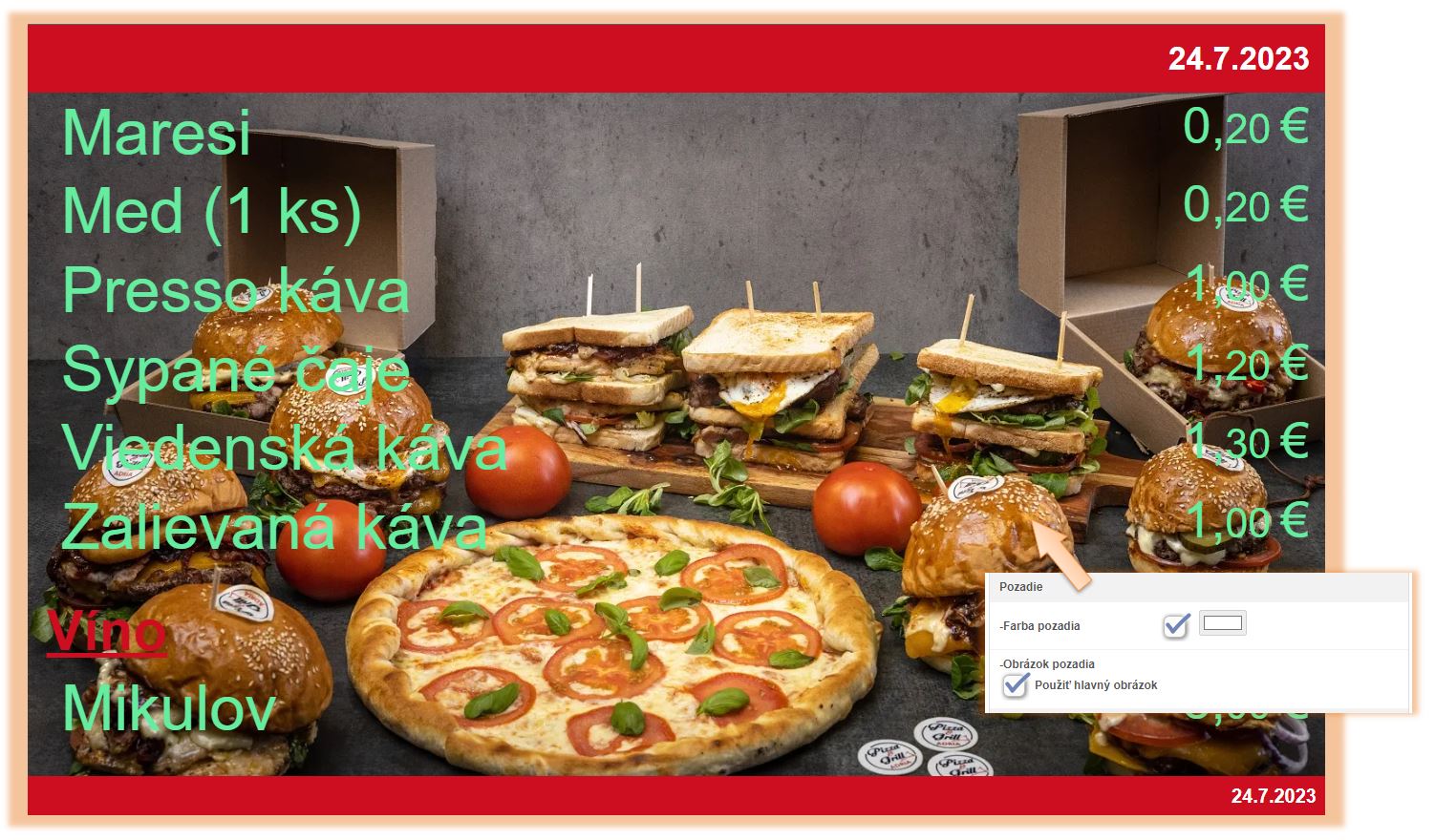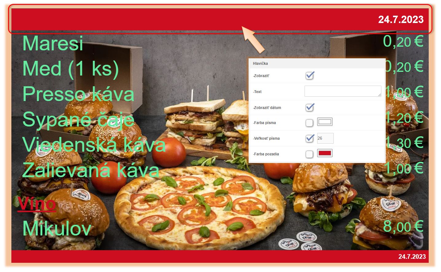 V tomto návode sa nachádza popis jednotlivých nastavení ponukového displeja v aplikácii iKelp POS Mobile. Nakoľko je ako zobrazovacie zariadenie možné použiť externý monitor, alebo napr. smart TV, prípadne akýkoľvek TV s android boxom, je jednoducho možné si nastavenia plne prispôsobiť vlastným potrebám. Či už veľkosťou písma, obrázkom pozadia alebo farbou jednotilivých textov. Zobrazenie je možné plne prispôsobiť štýlu každej prevádzky. Rovnako tak odporúčame prispôsobiť aj farbu písma prípadnému pozadiu, aby text bol dostatočne výrazný.