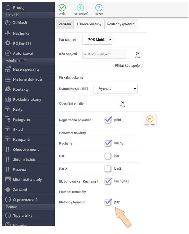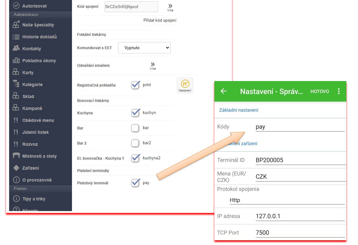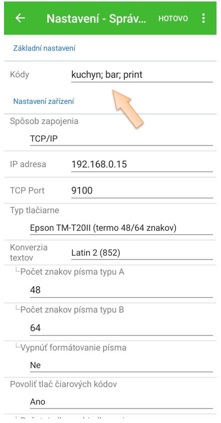 - Zadajte v častii Kódy názov (kód) zariadenia. (Kód zariadenia musí byť zhodný s kódom zariadenia z POS Mobile. Odporúčame ponechať kód pay, ak už tento nie je použitý na inom zariadení.)