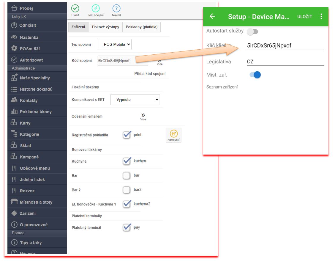 - Zadajte v častii Kódy názov (kód) zariadenia. (Kód zariadenia musí byť zhodný s kódom zariadenia z POS Mobile. Odporúčame ponechať prednastavený, ak už tento nebol použitý na inom zariadení.)