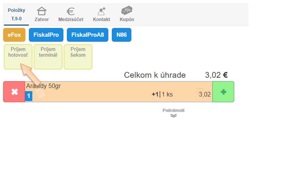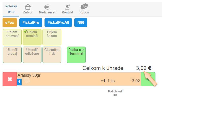 Opäť na vzorovom príklade rovnaká položka v sume 3,02€, pričom pri ukončovaní dokladu a výbere platidla Terminál už celková cena nie je zaokrúhlená. Tak isto ako v prvom príklade sa prijatá suma započíta do Nástenky aj záznamov pokladne v takej výške, ako bola prijatá od zákazníka.