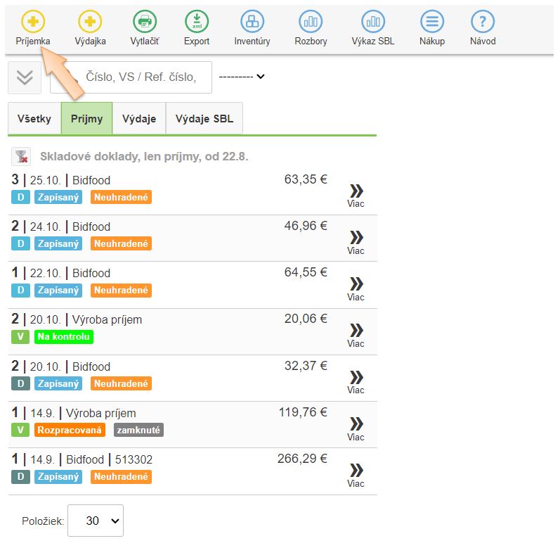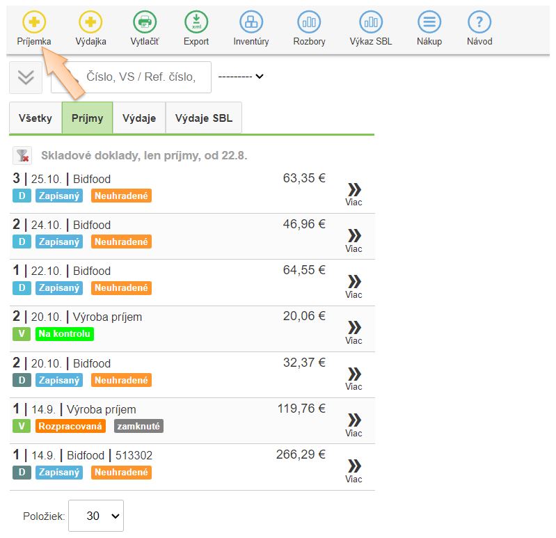 1. V menu Sklad vytvorte nový skladový doklad kliknutím na + Príjemka.