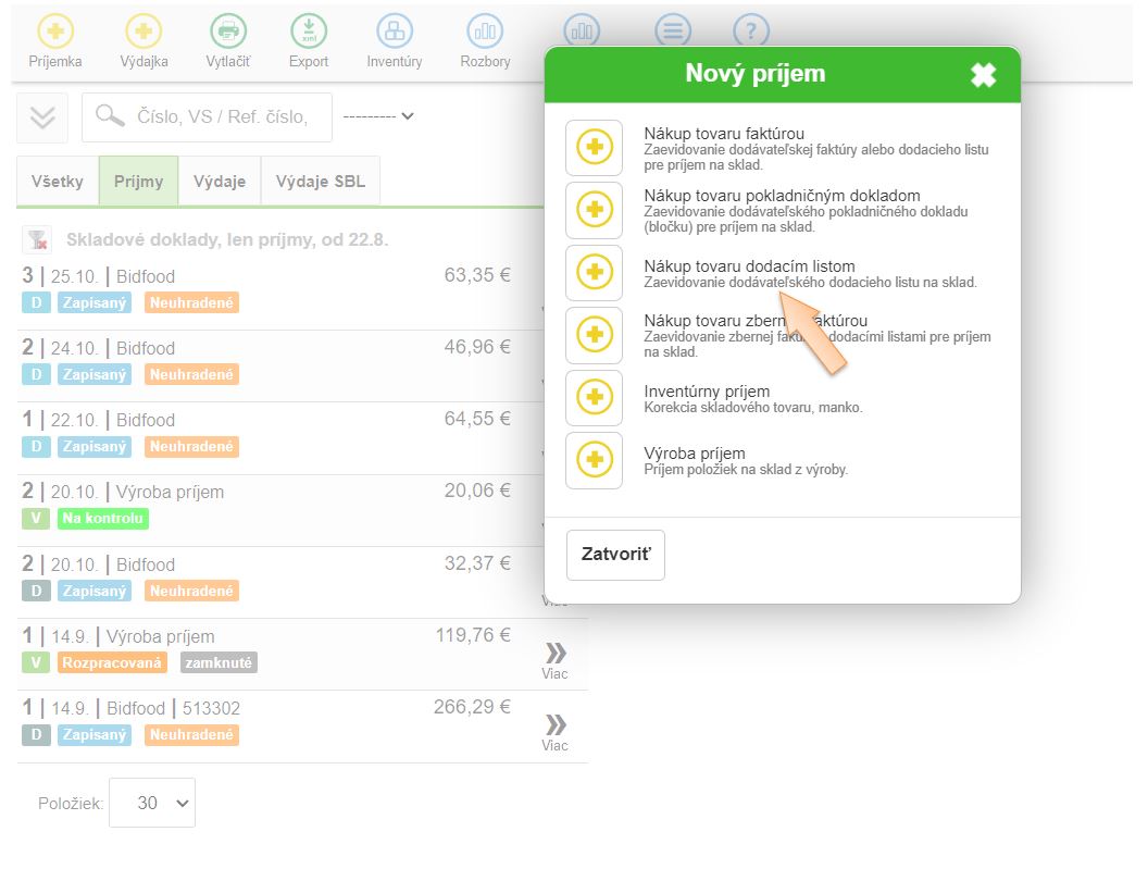 2. Druh skladového príjmu vyberte Nákup tovaru dodacím listom.