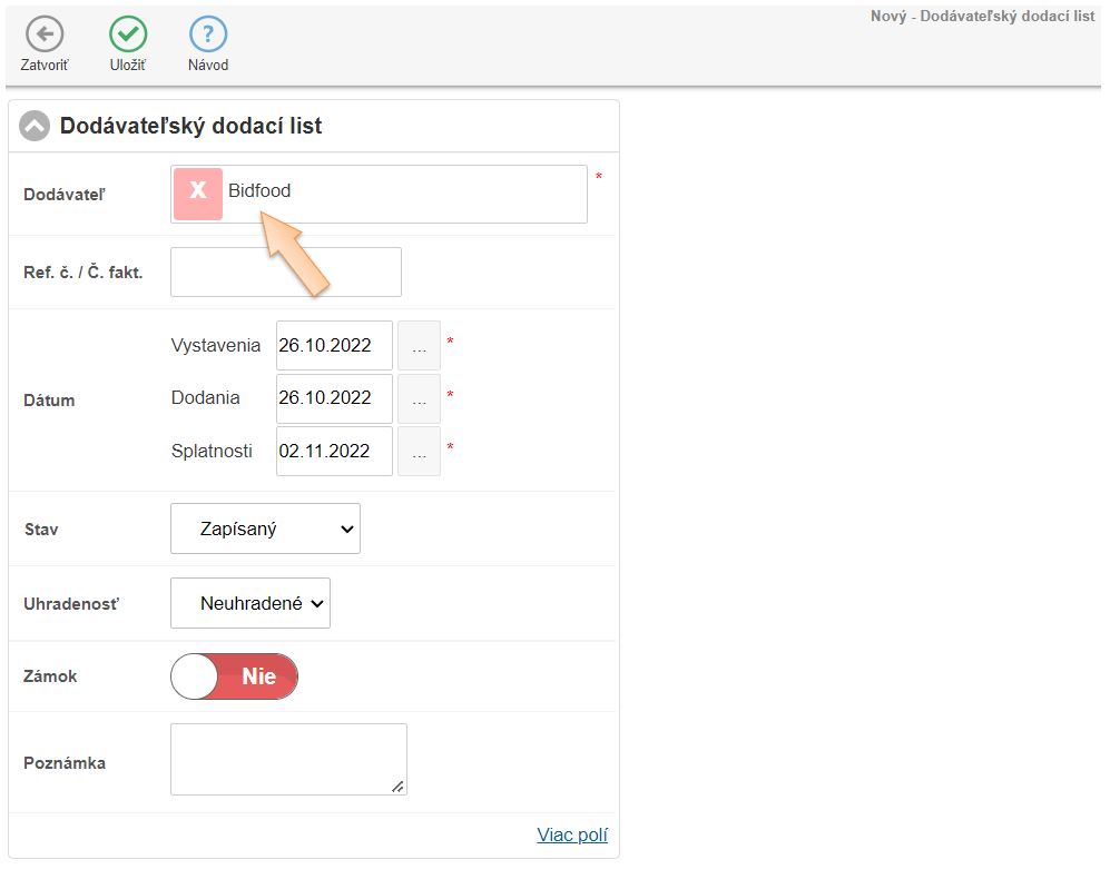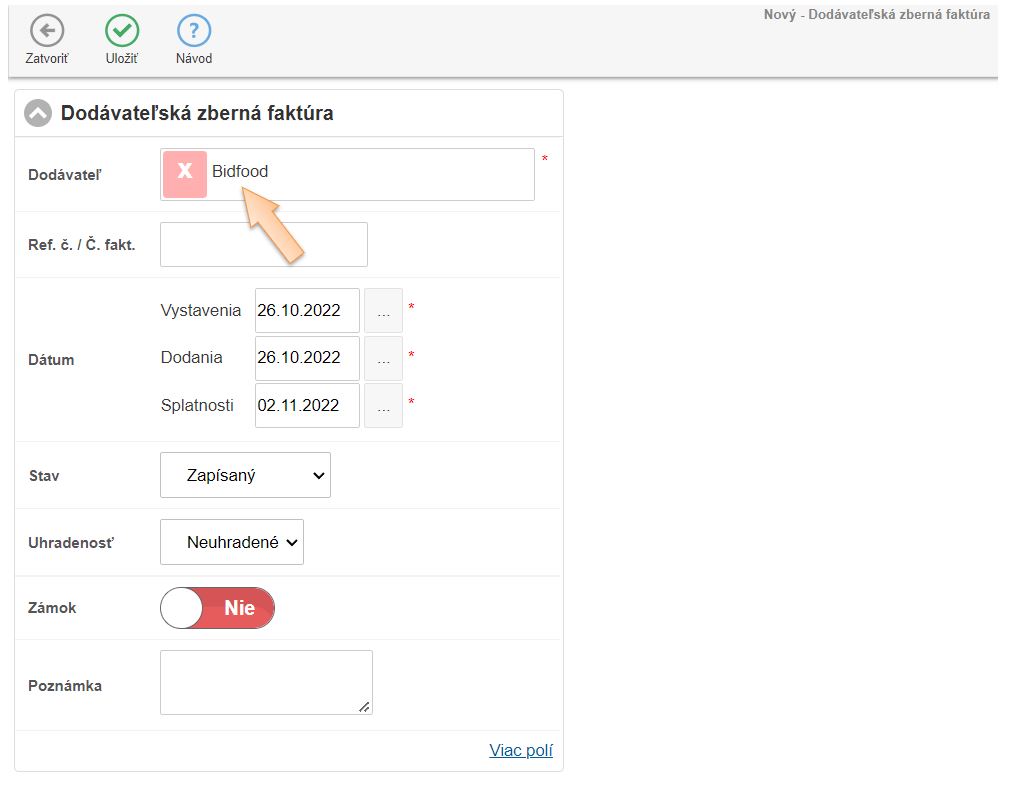 3. Vyberte Dodávateľa zo zoznamu kontaktov. (Je dôležité, aby na všetkých dokladoch bol rovnaký. Na základe kontaktu následne systém zobrazuje nenaviazané dodacie liste na dodávateľskú zbernú faktúru.)
