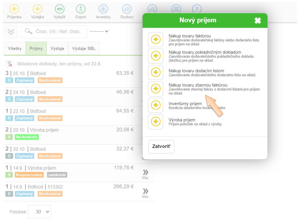 2. Druh skladového príjmu vyberte Nákup tovaru zbernou faktúrou.