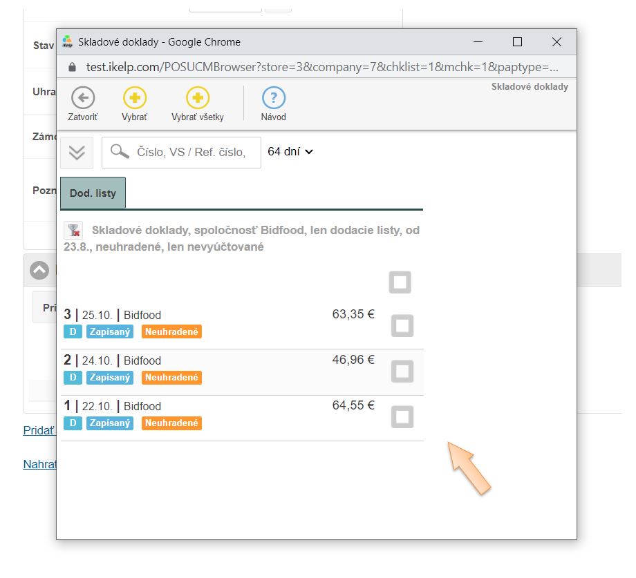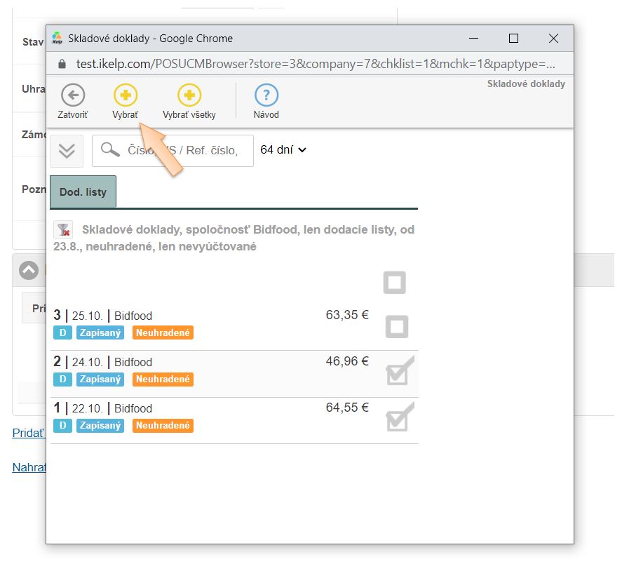 5. Označte doklady pre naviazanie na faktúru a kliknite na + Vybrať, alebo + Vybrať všetky pre výber všetkých zo zoznamu.