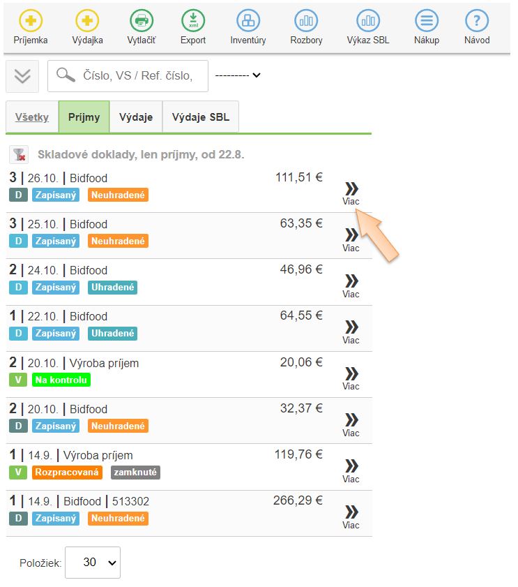 Po zaevidovaní a uložení dokladu je možné po kliknutí na tlačidlo >>Viac vykonať: