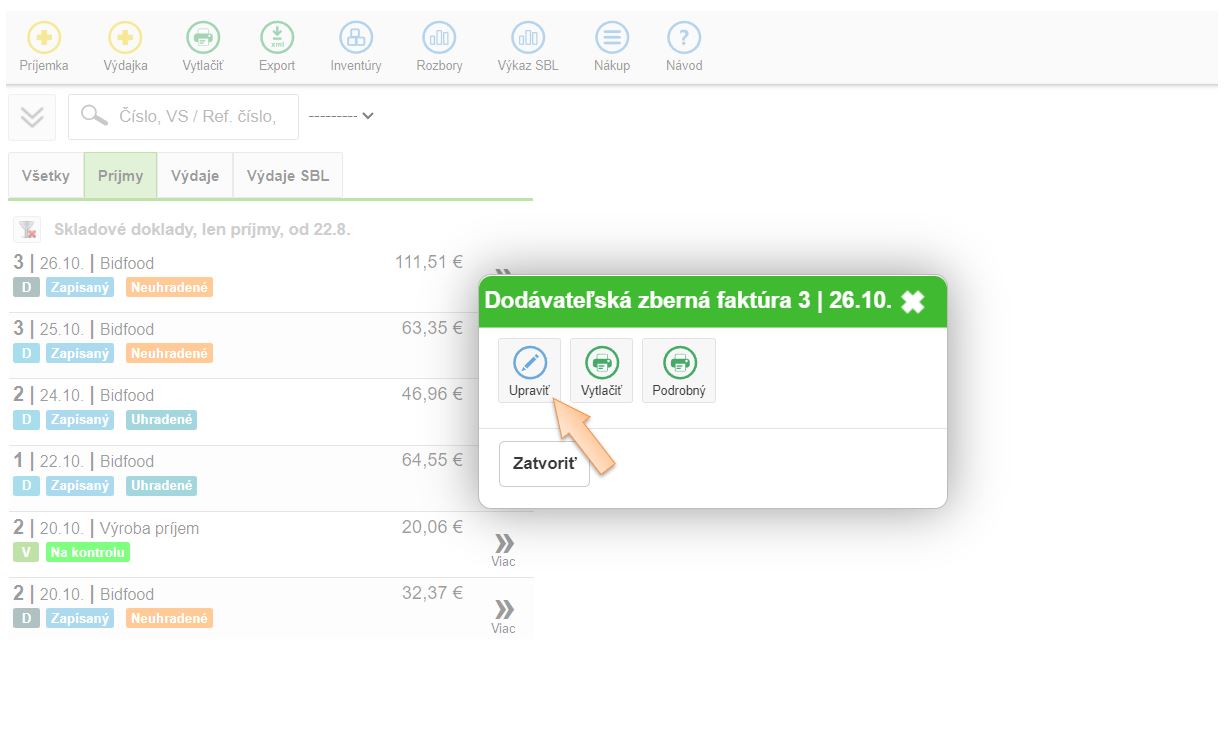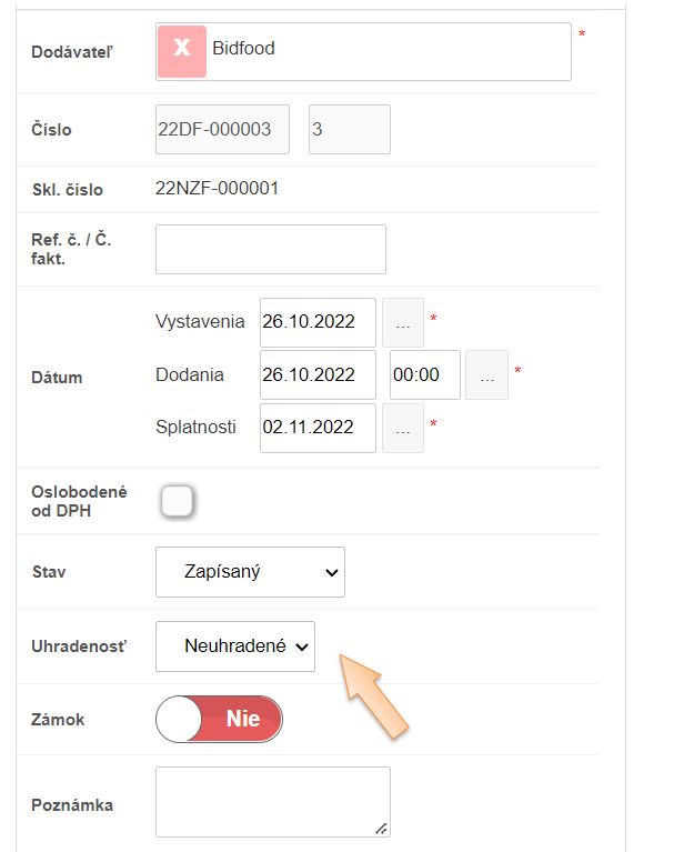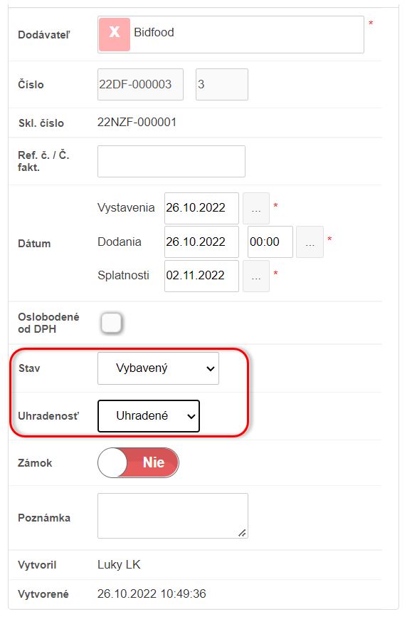 • Upraviť - upravenie dodávateľskej faktúry kde je možné definovať stav dokladu, stav uhradenosti alebo pridať poznámku.