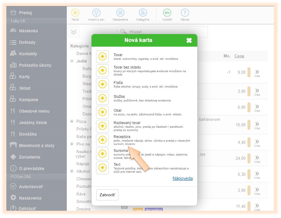 - Kliknutím na tlačidlo + Nová v zozname kariet vytvorte novú kartu typu Surovina:
