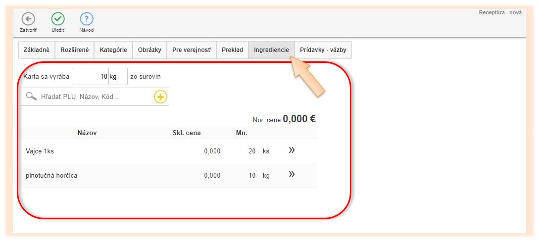 - V záložke Ingrediencie nadefinujte počet porcií pre výrobu. (Tento návod má ilustračný charakter, preto aj pomery pre výrobu sú len ilustračné a je potrebné si zadať reálne pomery na výrobu.)