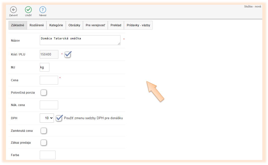 - Názov vyplňte "Domáca tatárska omáčka" ako mernú jednotku nastavte "kg". (Táto ingrediencia bude slúžiť pre ostatné receptúry, napr. Vyprážaný syr s hranolkami a tatárskou omáčkou a pod.)