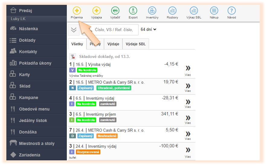- V menu aplikácie Sklad kliknite na + Príjemka a vyberte Inventúrny príjem.