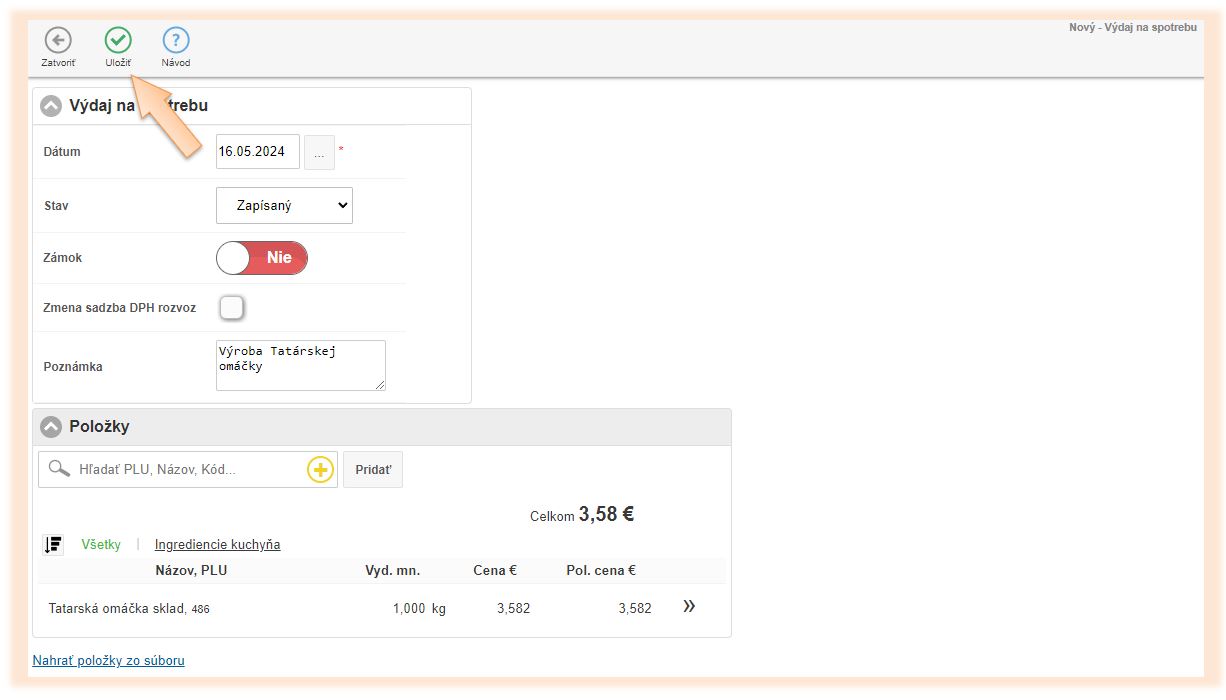 - Do výdajky pridajte kartu "Tatárska omáčka sklad" v množstve 1kg.