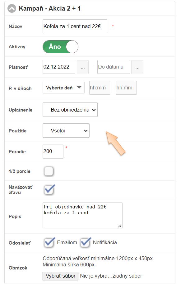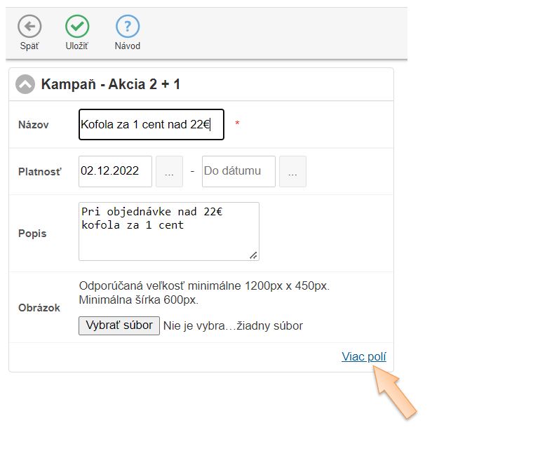 - Kliknutím na Viac polí je možné definovať rozšírené pravidlá kampane, ako uplatnenie, použitie alebo zadefinovať platnosť napr. konkrétny deň alebo hodinu.