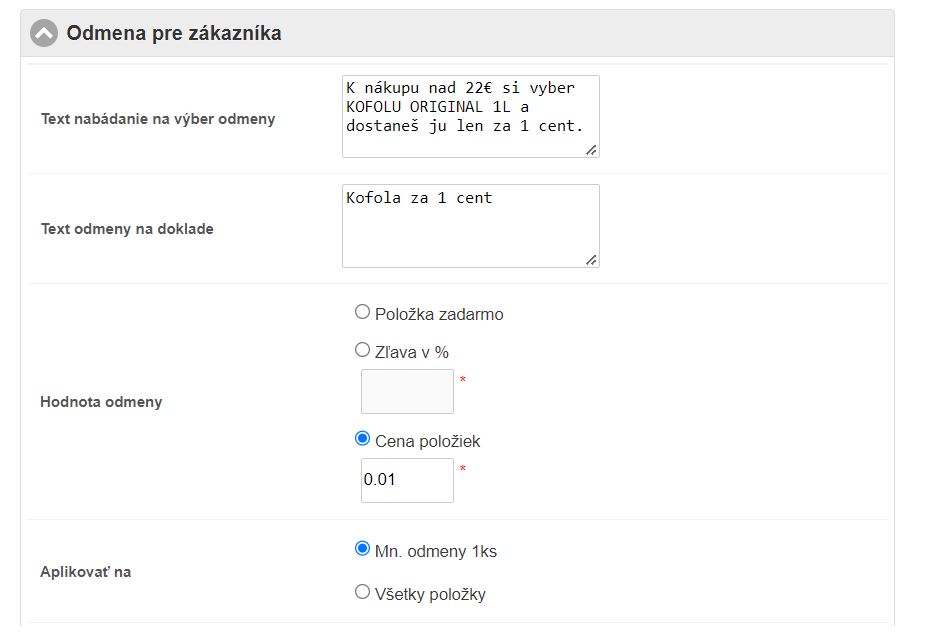 - Do poľa Mn. položiek zadajte počet položiek, ktoré musia byť v objednávke pre získanie odmeny. V našom prípade to môže byť aj 1.
