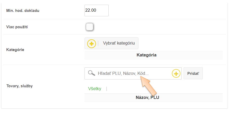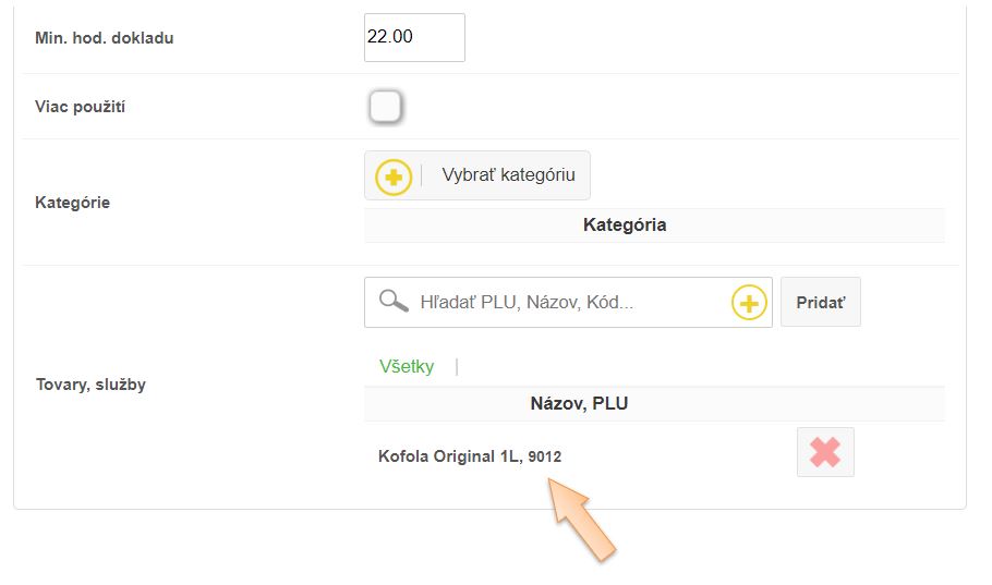 - Ak chcete umožniť výber rôznych položiek z ktorých bude poskytnutá zľava, je možné tieto pridať do zoznamu, alebo vybrať celú kategóriu napr. nealko nápoje. Následne sa akciová cena uplatní na poslednú pridanú položku z danej kategórie. Samozrejme je vhodné použiť správny popis, aby zákazník dostal presnú informáciu o možnosti využitia akciovej ceny.