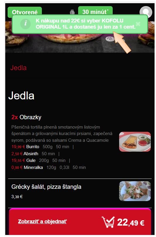 - V prípade, že by bola akciová cena za položku viazaná napr. len ku kategórii pizza, musela by hodnota objednávky zákazníka byť v hodnote 22€ z kategórie pizza. Ak by aj hodnota dokladu bola 22€ ale jednalo by sa o položky z iných kategórií, zákazník by nárok na zľavnenú položku nemal.