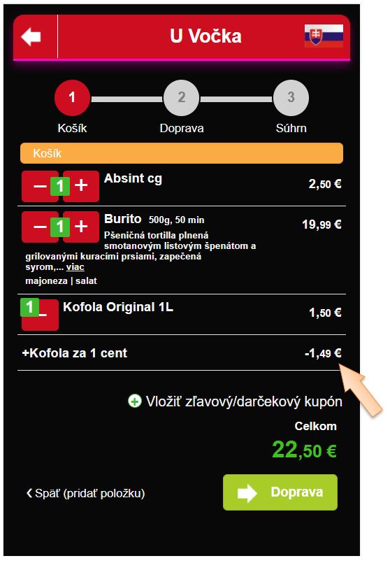 V tomto návode vám na praktickom príklade ukážeme, ako je možné v aplikácii nastaviť kampaň, ktorá umožní zákazníkovi po dosiahnutí určitej sumy za nákup si vybrať konkrétnu položku, alebo jednu položku z určitej kategórie za zvýhodnenú cenu. V tomto konkrétnom prípade, vytvoríme kampaň, ktorá umožní zákazníkovi si vybrať zľavnenú položku Kofolu Original 1L za 0,01€ pri objednávke nad 22€.